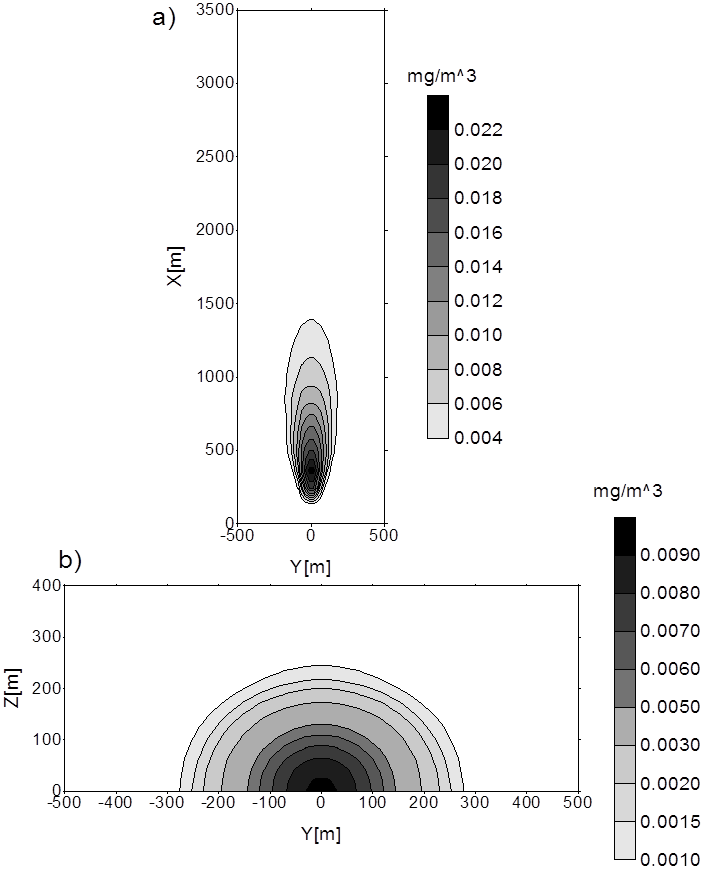 Rozkład zanieczyszczeń otrzymany metodą elementów skończonych w płaszczyźnie XY dla Z=0 (a) oraz w płaszczyźnie YZ dla X=900m (b); vy=0