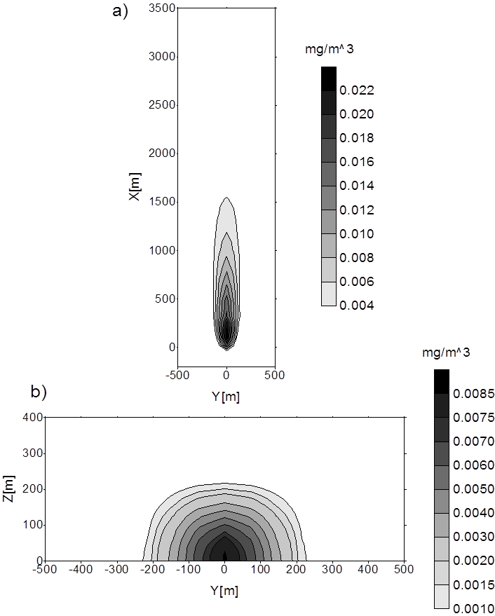 Rozkład zanieczyszczeń otrzymany modelem Pasquilla w płaszczyźnie XY dla Z=0 (a) oraz w płaszczyźnie YZ dla X=900m (b); vy=0